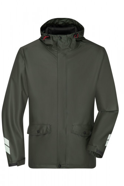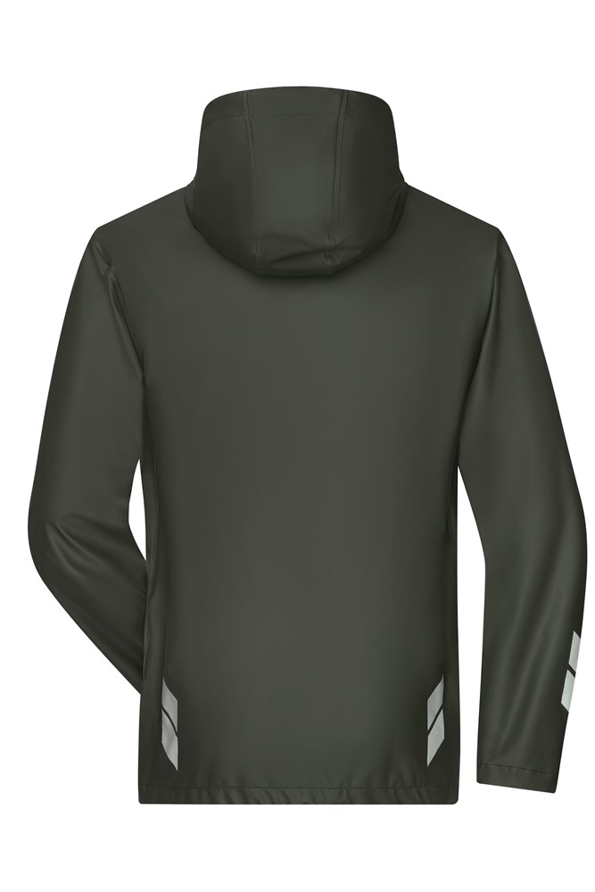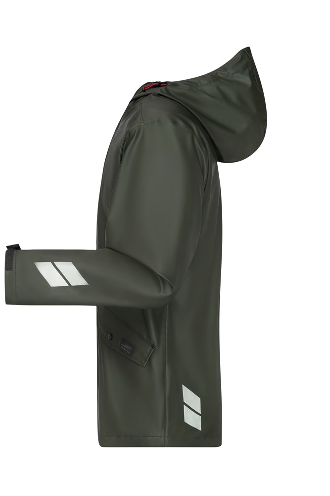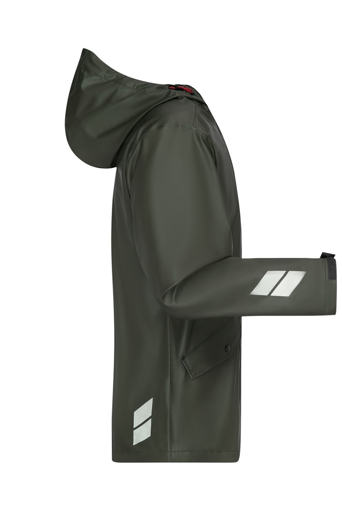 Wind- und wasserdichtes, elastisches Material (10.000 mm Wassersäule) Verschweißte Nähte Große, angeschnittene, regulierbare Kapuze, kann mit Schutzhelm getragen werden Weitenregulierung am Saum Klettverschluss zur Weitenregulierung am Ärmel 2 seitliche Taschen mit Patte und Druckknopf Reflexelemente (ohne Schutzfunktion/keine PSA) an Rückenteil und Ärmel Reißverschluss: YKK 1/2 Oberweite: 56 cm 1/2 Saumweite: 54 cm Länge ab Schulter Vorderteil: 74 cm Länge ab Schulter Rückenteil: 78 cm Ärmel Länge: 65 cm Größen bis 6XL Wassersäule ab 1.500 mm Wassersäule ab 2.000 mm Wassersäule ab 3.000 mm Wassersäule ab 5.000 mm Wassersäule ab 8.000 mm Nähte versiegelt YKK - Reißverschluss