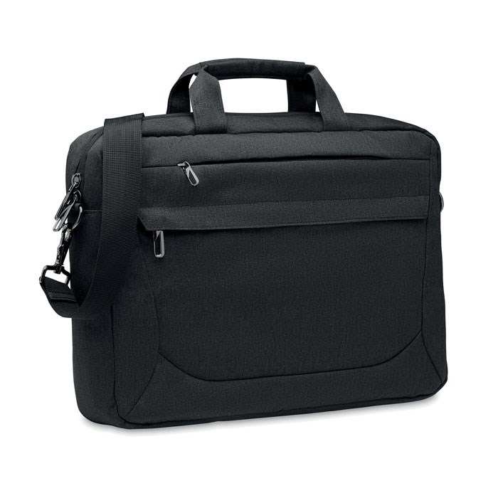 15'' Laptop-Tasche aus 600D RPET Polyester. 2 Hauptfächer für Laptop und Tablet sowie große Frontreißverschlusstasche. Kleine Tasche mit Reißverschluss. Abnehmbare und verstellbare Schultergurte. Trolley- Halterung.