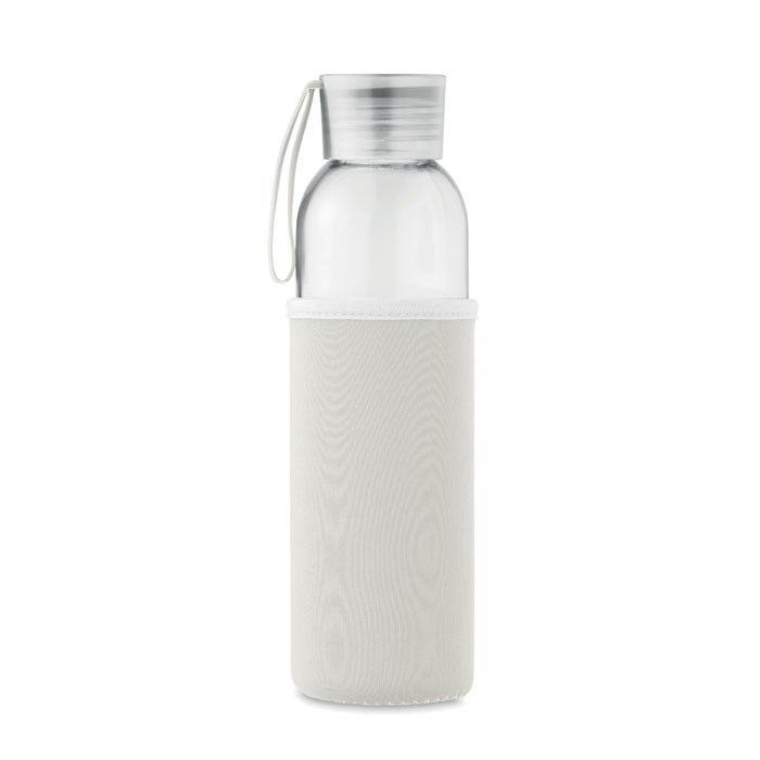 Trinkflasche aus recyceltem Glas mit Neopren-Schutzhülle und PP-Deckel mit Silikon-Schlaufe. Auslaufsicher. Füllmenge: 500 ml.