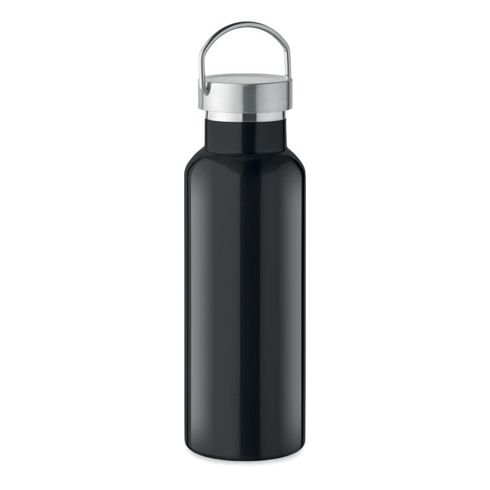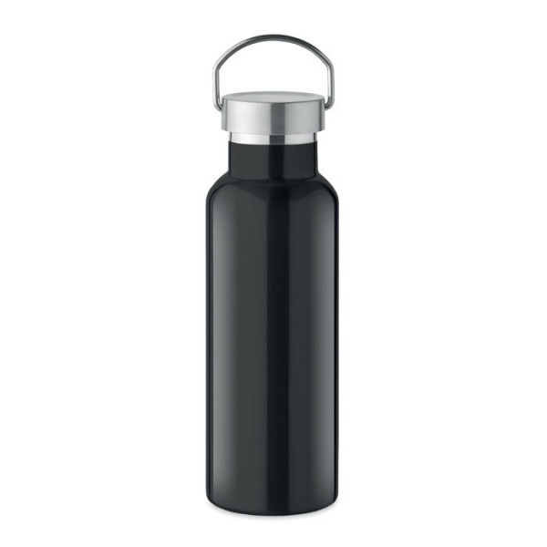 Doppelwandige Isolierflasche aus recyceltem Edelstahl (90 % recycelter Edelstahl und 10 % Edelstahl). Verschluss mit Henkel. Füllmenge: 500 ml.