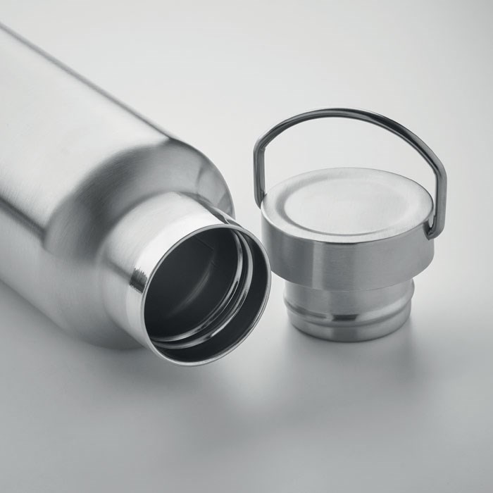 Doppelwandige Isolierflasche aus recyceltem Edelstahl (90 % recycelter Edelstahl und 10 % Edelstahl). Verschluss mit Henkel. Füllmenge: 500 ml.