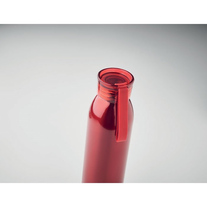 Einwandige Trinkflasche aus Edelstahl mit PP-Deckel und Silikonaufhänger. Füllmenge: 650 ml. Da der einwandige Trinkflasche die Hitze nach außen leiten kann, kann der Artikel heiß werden.