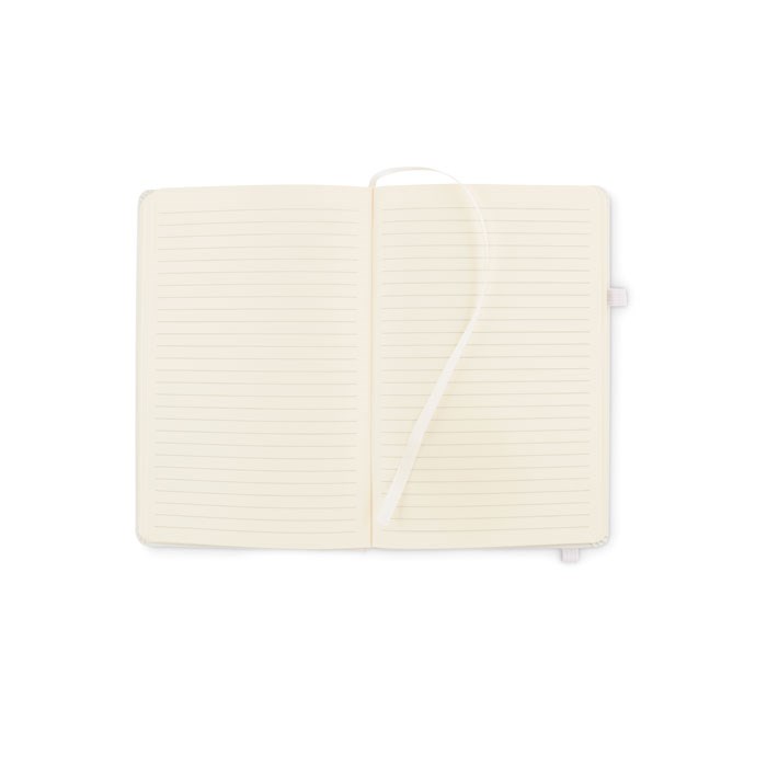 DIN A5 Notizbuch mit Hardcover aus 70% recyceltem Pre-Consumer-Leder und 30% PU-Latex. 96 Blatt (192 Seiten) liniertes Recyclingpapier. Mit farblich passendem elastischen Baumwoll Verschlussband und Stiftschlaufe.