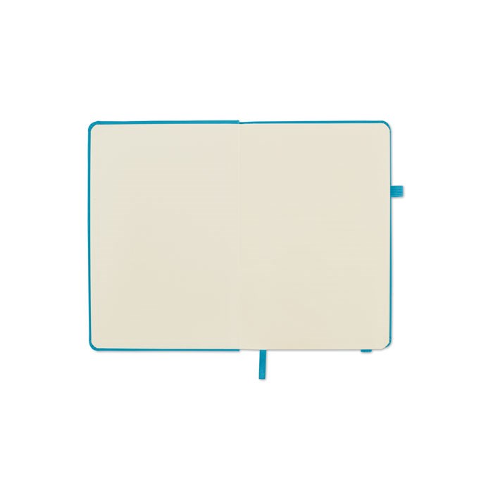 DIN A5 Notizbuch mit Hardcover aus 70% recyceltem Pre-Consumer-Leder und 30% PU-Latex. 96 Blatt (192 Seiten) liniertes Recyclingpapier. Mit farblich passendem elastischen Baumwoll Verschlussband und Stiftschlaufe.