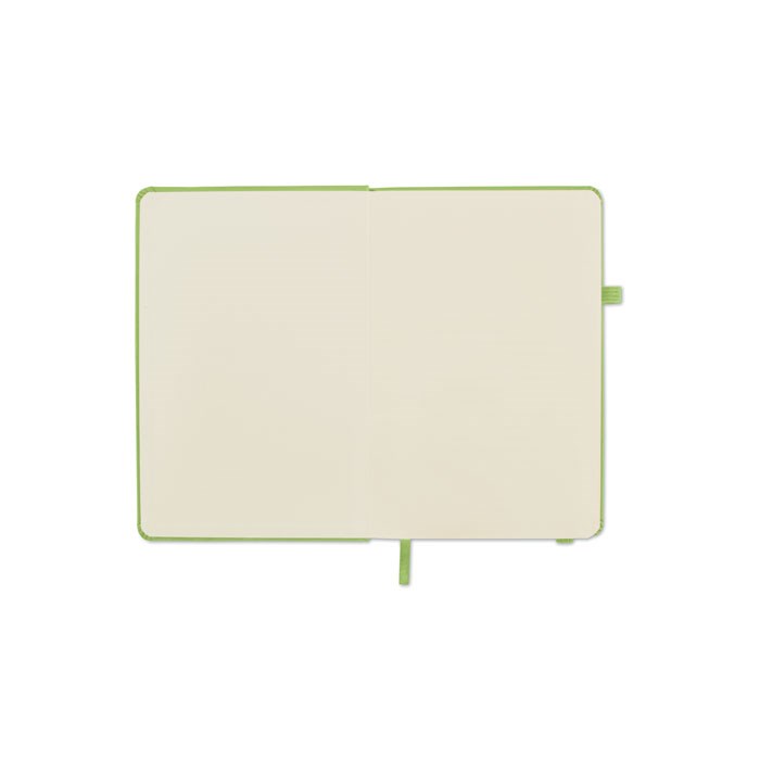 DIN A5 Notizbuch mit Hardcover aus 70% recyceltem Pre-Consumer-Leder und 30% PU-Latex. 96 Blatt (192 Seiten) liniertes Recyclingpapier. Mit farblich passendem elastischen Baumwoll Verschlussband und Stiftschlaufe.