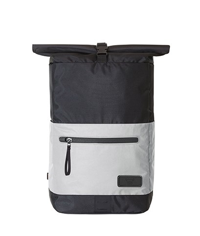 stylisher, reflektierender Rolltop-Rucksack mit Reißverschluss-Hauptfach und Steckverschluss; HFL®-Träger für Ihr Logo; gepolstertes Einsteckfach und Reißverschluss-Netzfach innen; zwei seitliche Einsteckfächer; Reißverschluss-Vortasche; LED-Fahrradlicht-Befestigungsmöglichkeit; gepolstertes Tragesystem mit höhenverstellbarem Brustgurt; Handgriff