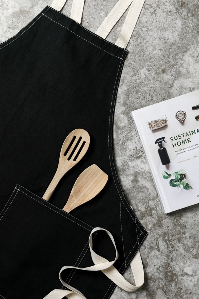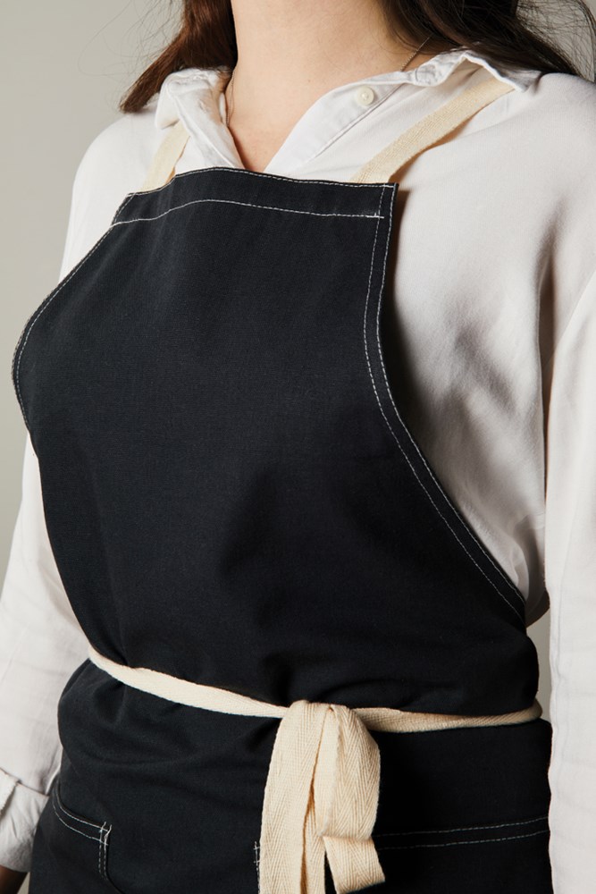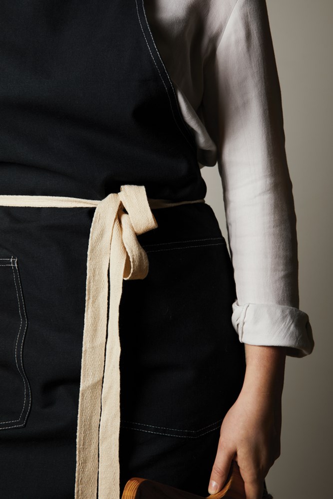 Schürze aus 70 % zertifizierter, recycelter Baumwolle aus Baumwollresten der Lieferanten. Fasern, die normalerweise als unbrauchbar gelten, haben mit dem entsprechenden Herstellungsverfahren die gewünschten Eigenschaften erreicht. Diese Schürze ist extra breit, um maximalen Schutz zu bieten. Zwei große Fronttaschen und eine Schlaufe zum Aufhängen von Utensilien oder einem Geschirrtuch.