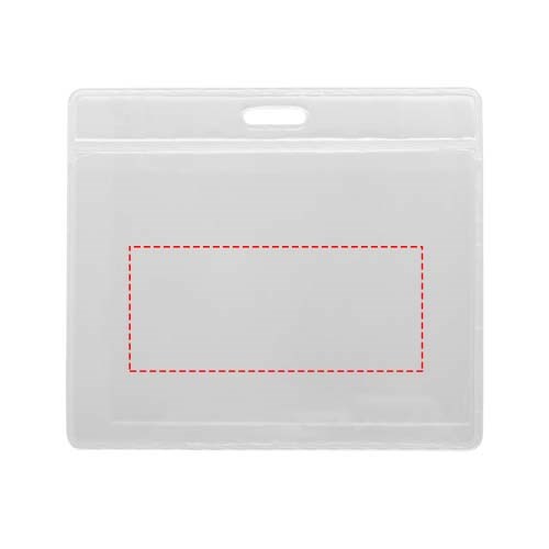 Ausweishülle mit Einschubfach hinten und Öffnung oben, um die Hülle an einem Lanyard oder Rollerclip zu befestigen. Maße: 8,8 x 10 cm für Karten bis 9,4 x 6,7 cm.