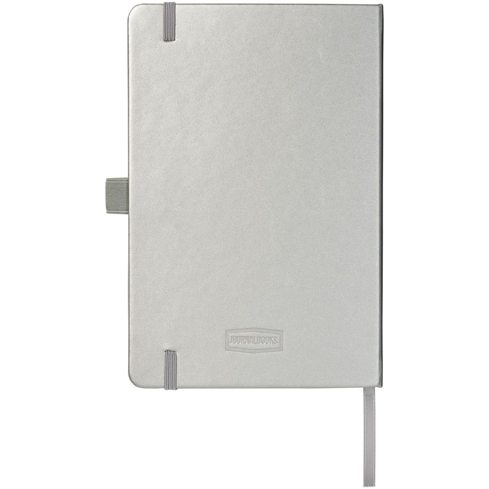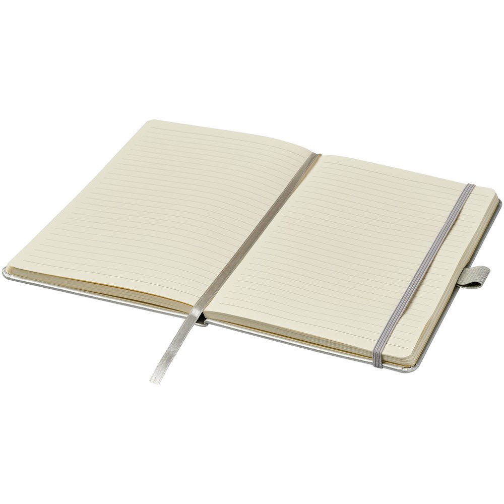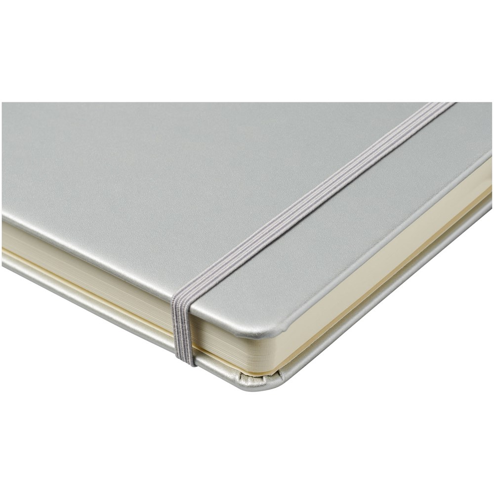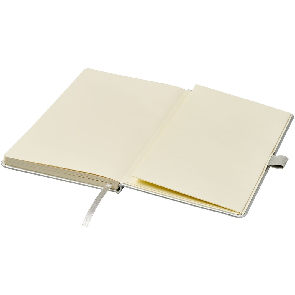 Kunstleder-A5-Notizbuch (14,2 x 21,4 cm, Lederimitat) mit Gummiband, Farbband, Stiftschlaufe und Akkordeon-Tasche an der Rückseite. Enthält 96 Blätter cremefarbenes Papier in 80 g/m2 und wird in einem Journalbook mit weißer Hülle angeboten.