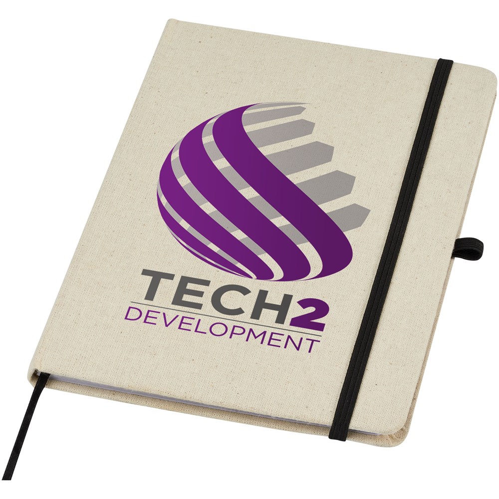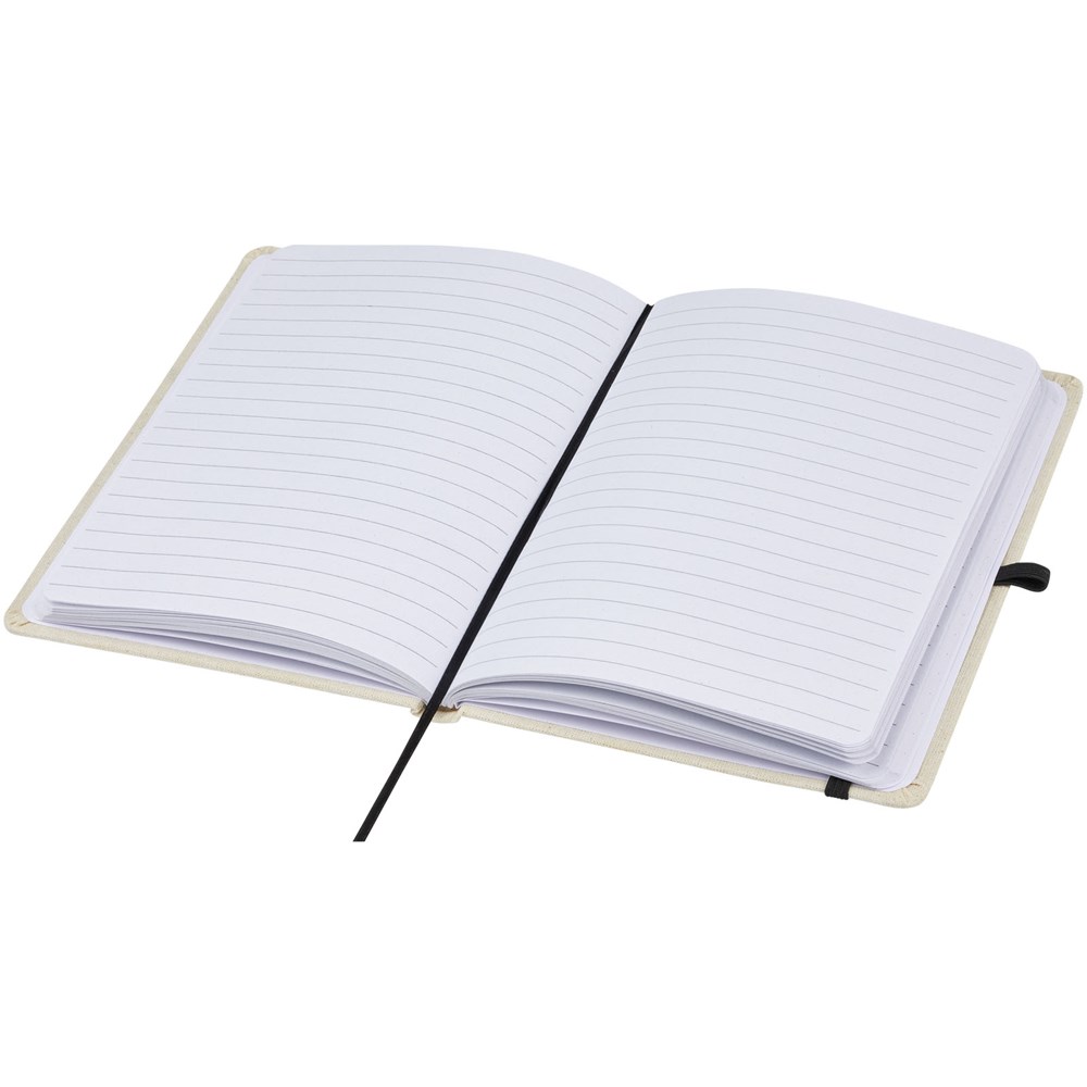 Notizbuch aus Bio Baumwolle mit 120 Seiten aus weißem, liniertem, recyceltem Papier (70 g/m2). Ausgestattet mit einem schwarzen Farbband, einem Elastikverschluss und einer Stiftschlaufe. Bio Baumwolle wird mit nachhaltigen Anbaumethoden angebaut, die zum Schutz der Umwelt und zur Förderung der Artenvielfalt beitragen. Durch den Verzicht auf schädliche Chemikalien kann der ökologische Anbau von Baumwolle dazu beitragen, die Boden- und Wasserverschmutzung sowie das Risiko von Gesundheitsproblemen für Landwirte und deren Familien zu verringern.