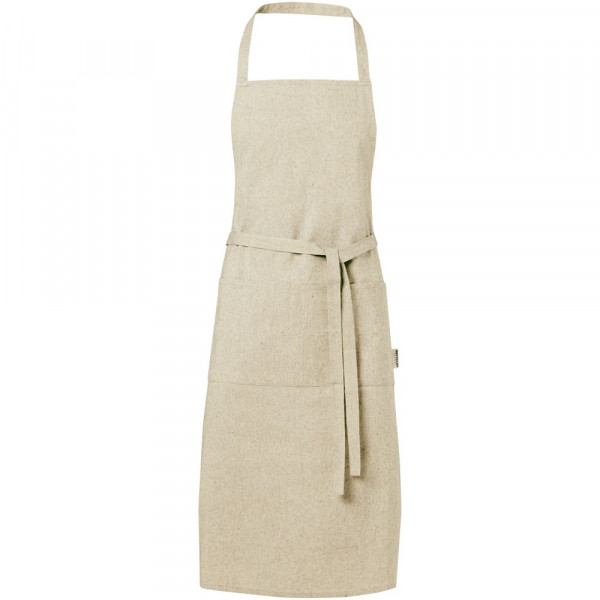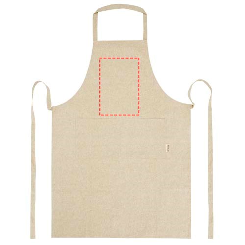 Schürze aus 200 g/m² recycelter Baumwolle und recyceltem Polyester. Mit 2 nebeneinander liegenden Taschen mit einer Gesamtgröße von 45 x 20 cm und einem 1 Meter Bindeband. Recycling Baumwolle wird aus Verbrauchsabfällen hergestellt, die während des Schneidevorgangs in Textilfabriken anfallen. Aufgrund des Produktionsprozesses kann es zu geringfügigen Farbabweichungen des Produktes kommen. Diese Eigenschaft trägt deutlich zu einem authentischeren Erscheinungsbild bei. Länge des Nackenbandes: 55 cm.