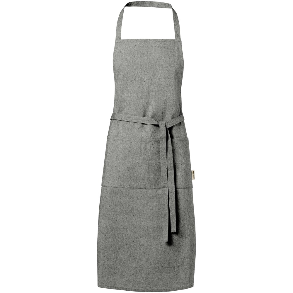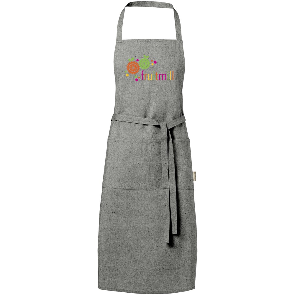 Schürze aus 200 g/m² recycelter Baumwolle und recyceltem Polyester. Mit 2 nebeneinander liegenden Taschen mit einer Gesamtgröße von 45 x 20 cm und einem 1 Meter Bindeband. Recycling Baumwolle wird aus Verbrauchsabfällen hergestellt, die während des Schneidevorgangs in Textilfabriken anfallen. Aufgrund des Produktionsprozesses kann es zu geringfügigen Farbabweichungen des Produktes kommen. Diese Eigenschaft trägt deutlich zu einem authentischeren Erscheinungsbild bei. Länge des Nackenbandes: 55 cm.