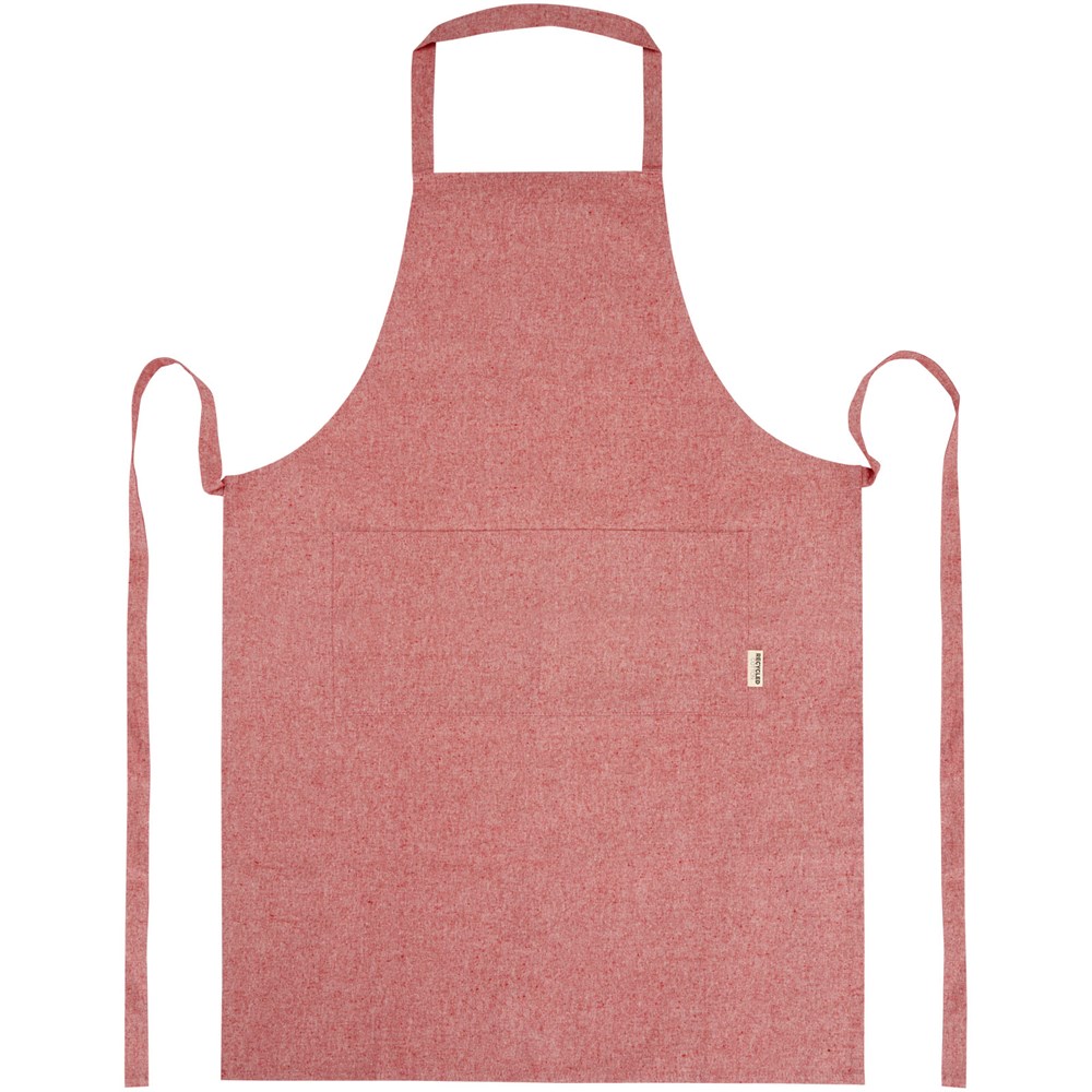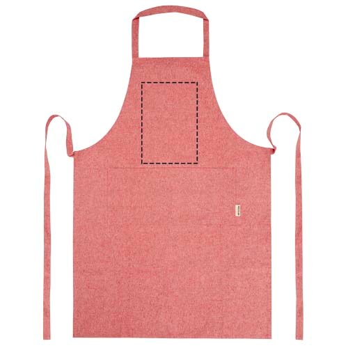 Schürze aus 200 g/m² recycelter Baumwolle und recyceltem Polyester. Mit 2 nebeneinander liegenden Taschen mit einer Gesamtgröße von 45 x 20 cm und einem 1 Meter Bindeband. Recycling Baumwolle wird aus Verbrauchsabfällen hergestellt, die während des Schneidevorgangs in Textilfabriken anfallen. Aufgrund des Produktionsprozesses kann es zu geringfügigen Farbabweichungen des Produktes kommen. Diese Eigenschaft trägt deutlich zu einem authentischeren Erscheinungsbild bei. Länge des Nackenbandes: 55 cm.