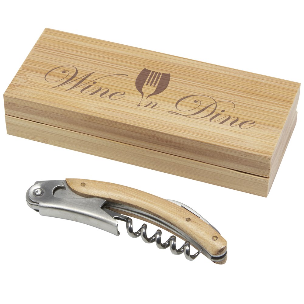 Kellnermesser aus Edelstahl mit Korkenzieher und einziehbarem Folienmesser, mit natürlichem Bambus am Griff. Der verwendete Bambus wird nach nachhaltigen Normen beschafft und produziert.