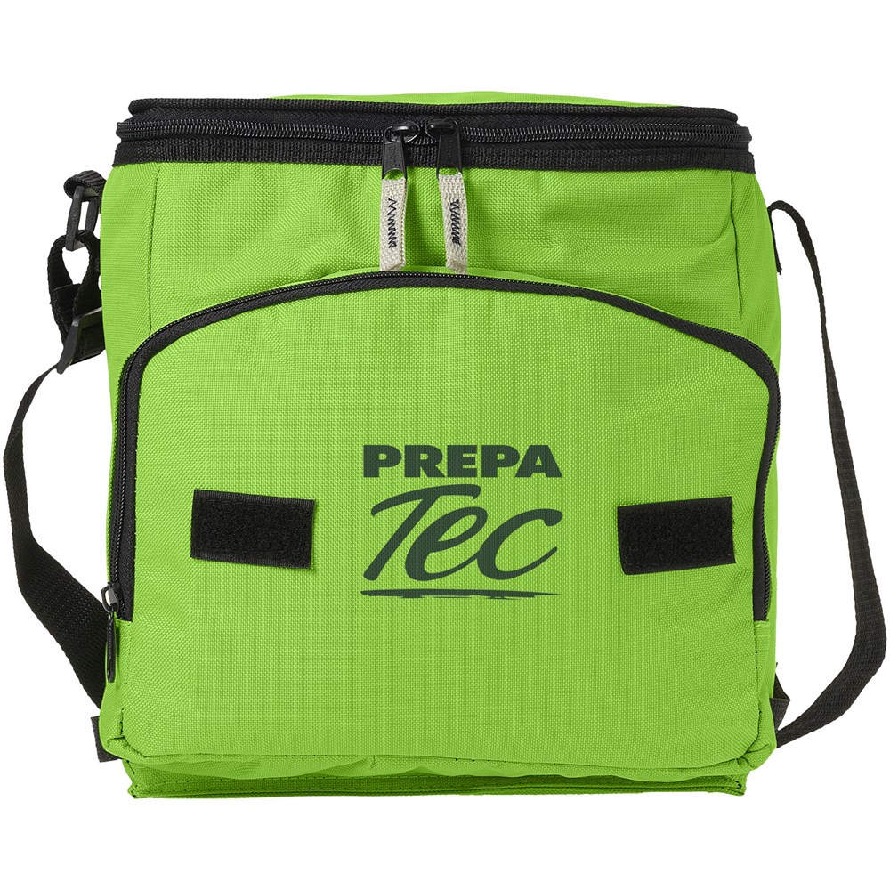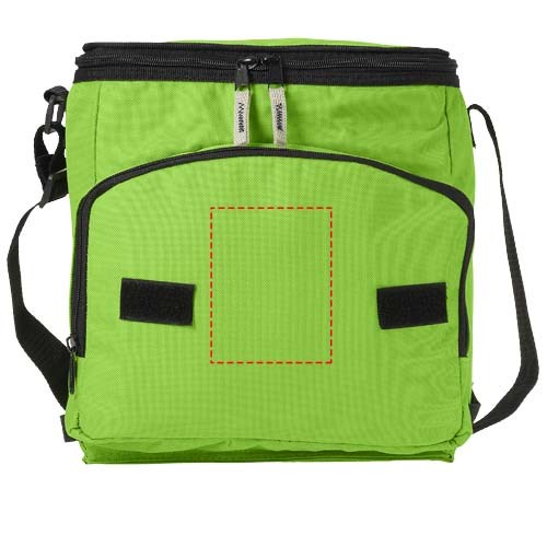 Zusammenfaltbare Kühltasche mit Hauptfach mit Reißverschluss und Fronttasche mit Reißverschluss. Verstellbarer Schulterriemen. Die Kühltasche kann dank des Klettverschlusses an der Fronttasche flach zusammengefaltet werden.