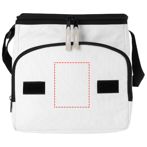 Zusammenfaltbare Kühltasche mit Hauptfach mit Reißverschluss und Fronttasche mit Reißverschluss. Verstellbarer Schulterriemen. Die Kühltasche kann dank des Klettverschlusses an der Fronttasche flach zusammengefaltet werden.