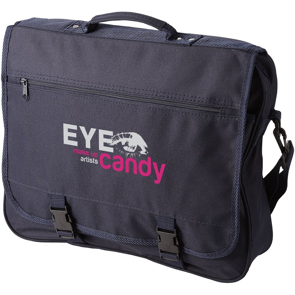 Messetasche mit einstellbarem Schulterriemen, Klappe mit Schnallenverschluss, Reißverschlussfach in der Klappe, Hauptfach mit Reißverschluss und mehreren offenen Fächern unter der Klappe.