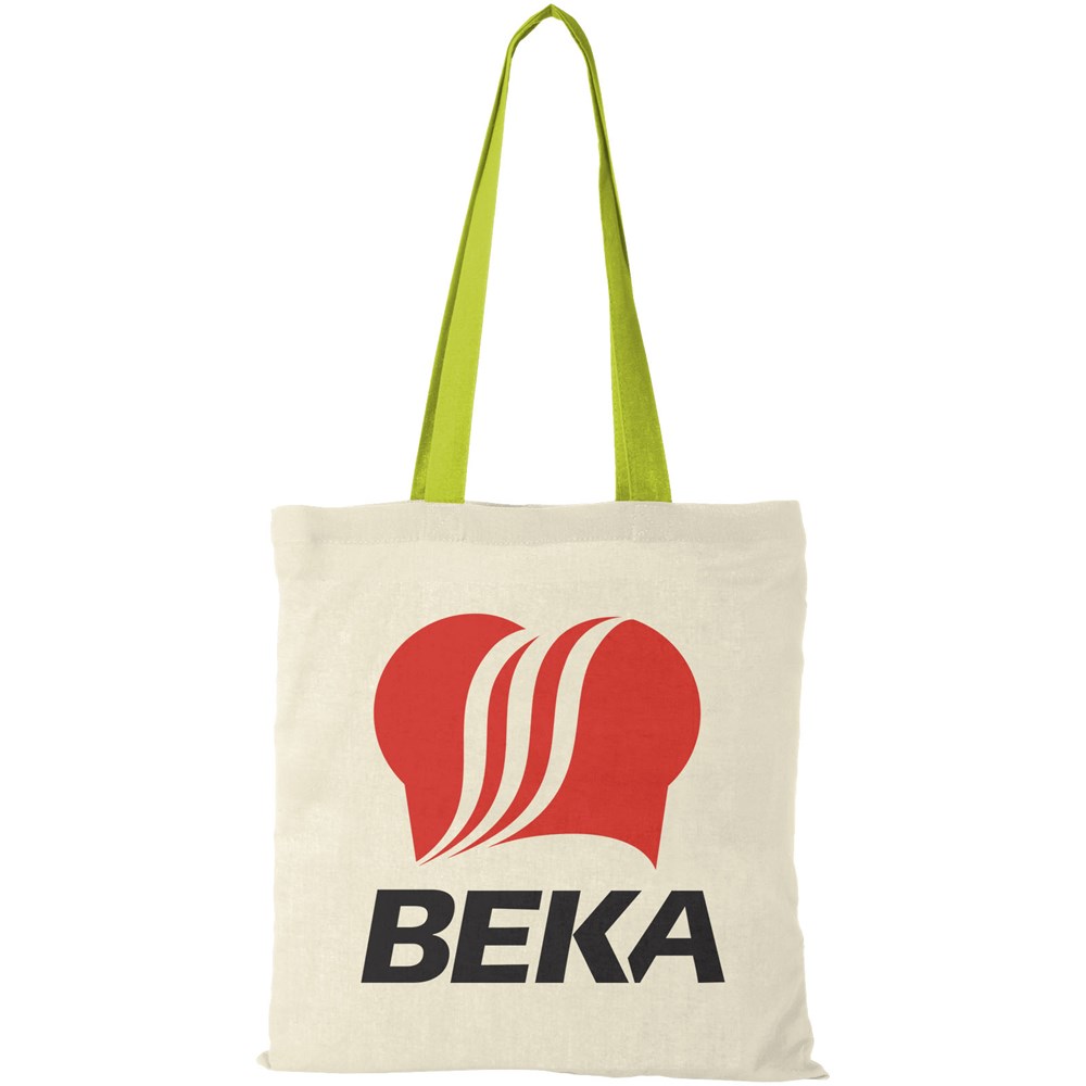 Mit ihren farbenfrohen Tragegriffen setzt diese Tasche auf jeder Veranstaltung, jedem Kongress und jedem Festival einen Farbakzent. Die Nevada Tote Bag aus 100 g/m² Baumwolle ist eine preisgünstige und leichte Tasche mit einem offenen Hauptfach. Mit ihrem Fassungsvermögen von 7 Litern eignet sich diese Tasche perfekt für den Transport von alltäglichen Dingen, vom Telefon und der Geldbörse bis hin zum Lieblingsbuch oder Tablet. Dank der 30 cm langen Griffe lässt sich die Tasche gut tragen. Hergestellt in Indien und OEKO-Tex zertifiziert. Belastbar bis zu 5 kg Gewicht.