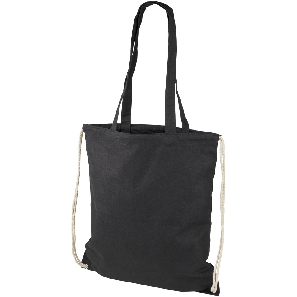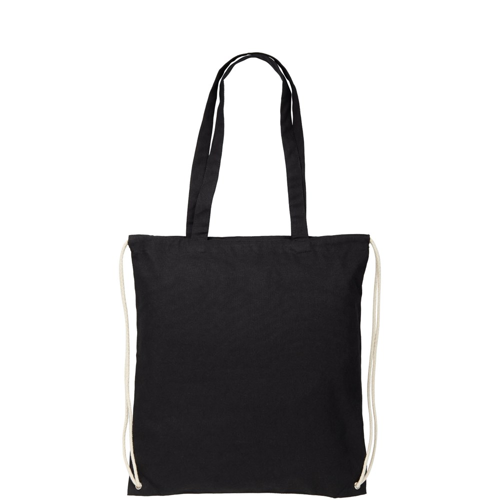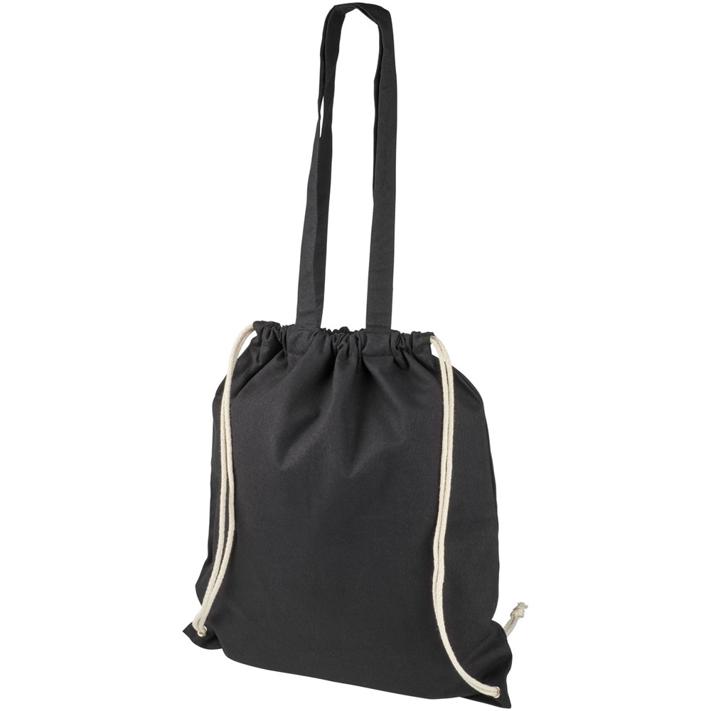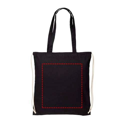Multifunktionaler Baumwolltsportbeutel mit langen Griffen und Kordelzug, der als Tasche oder Rucksack getragen werden kann. Großes Hauptfach mit Kordelzugverschluss. Mit zwei herunterklappbaren Griffen von 31 cm Länge. Kapazität: 6 l, für bis zu 5 kg Gewicht.