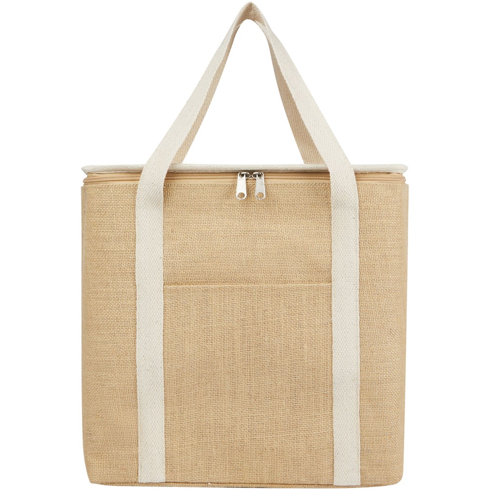 Die große Juta Kühltasche ist aus robuster und verschleißfester laminierter Jute gefertigt. Verfügt über ein großes Hauptfach (19 Liter) mit Platz für sechs 1,5-Liter-Flaschen, das mit extra dicker und lebensmittelechter Aluminiumisolierung ausgestattet ist, damit Getränke, Erfrischungen und Tiefkühlprodukte stundenlang kühl und von äußeren Einflüssen abgeschirmt bleiben. Die Tasche hat einen Reißverschluss an der Oberseite, eine Fronttasche und 2 gewebte Baumwolltragegriffe (50 × 2,5 cm). Hergestellt in Indien und OEKO-TEX® zertifiziert.