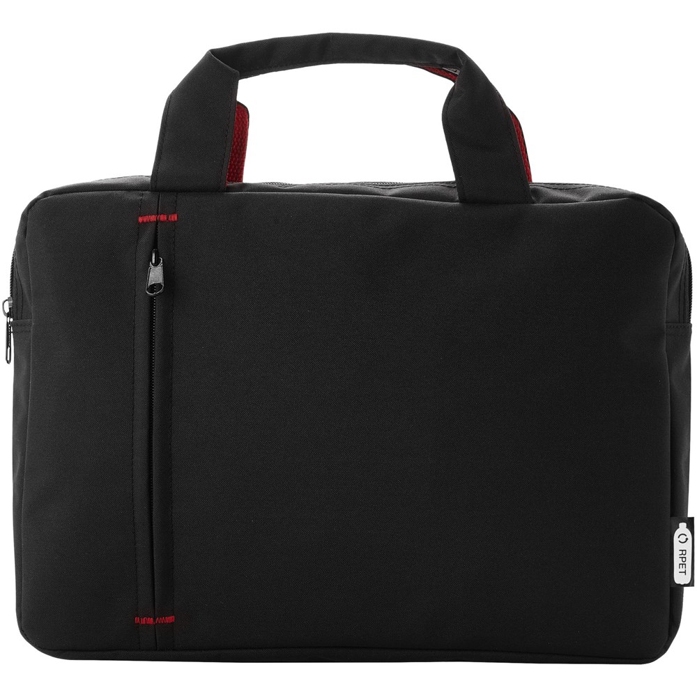 Konferenztasche aus recyceltem PET Kunststoff mit einem Hauptfach mit Reißverschluss und einer Reißverschlusstasche auf der Vorderseite, mit verstärkten Tragegriffen an der Oberseite und trendigen farblichen Kontrastelementen.