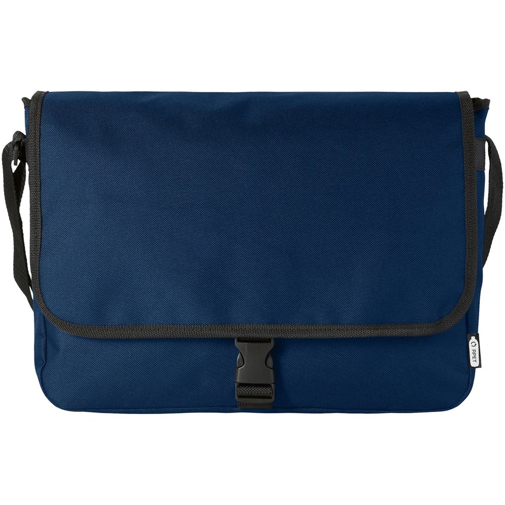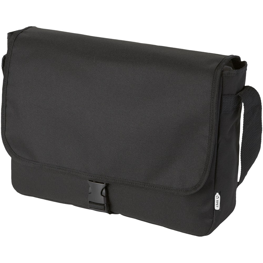 Umhängetasche aus recyceltem PET Kunststoff mit einem verstellbaren Schultergurt. Mit einem Hauptfach, das mit einer Klappe und einem Schnallenverschluss geschlossen wird.