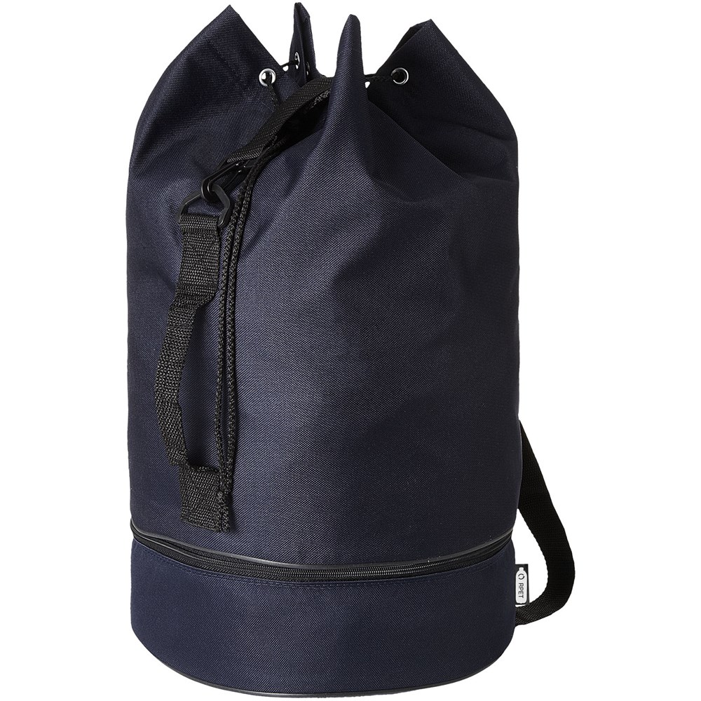 Wasserabweisende Reisetasche aus recyceltem PET Kunststoff mit einem geräumigen 20-Liter-Hauptfach mit Kordelzugverschluss, seitlichem Tragegriff und verstellbarem Schultergurt. Außerdem gibt es ein separates Bodenfach mit Reißverschluss für kleinere Gegenstände.