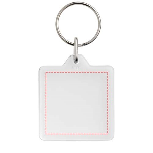 Transparenter, quadratischer U1-Schlüsselanhänger mit metallenem Schlüsselring. Der Metallring bietet ein flaches Profil, das sich ideal für Mailings eignet. Abmessungen der Druckeinlage: 3,2 cm x 3,2 cm.