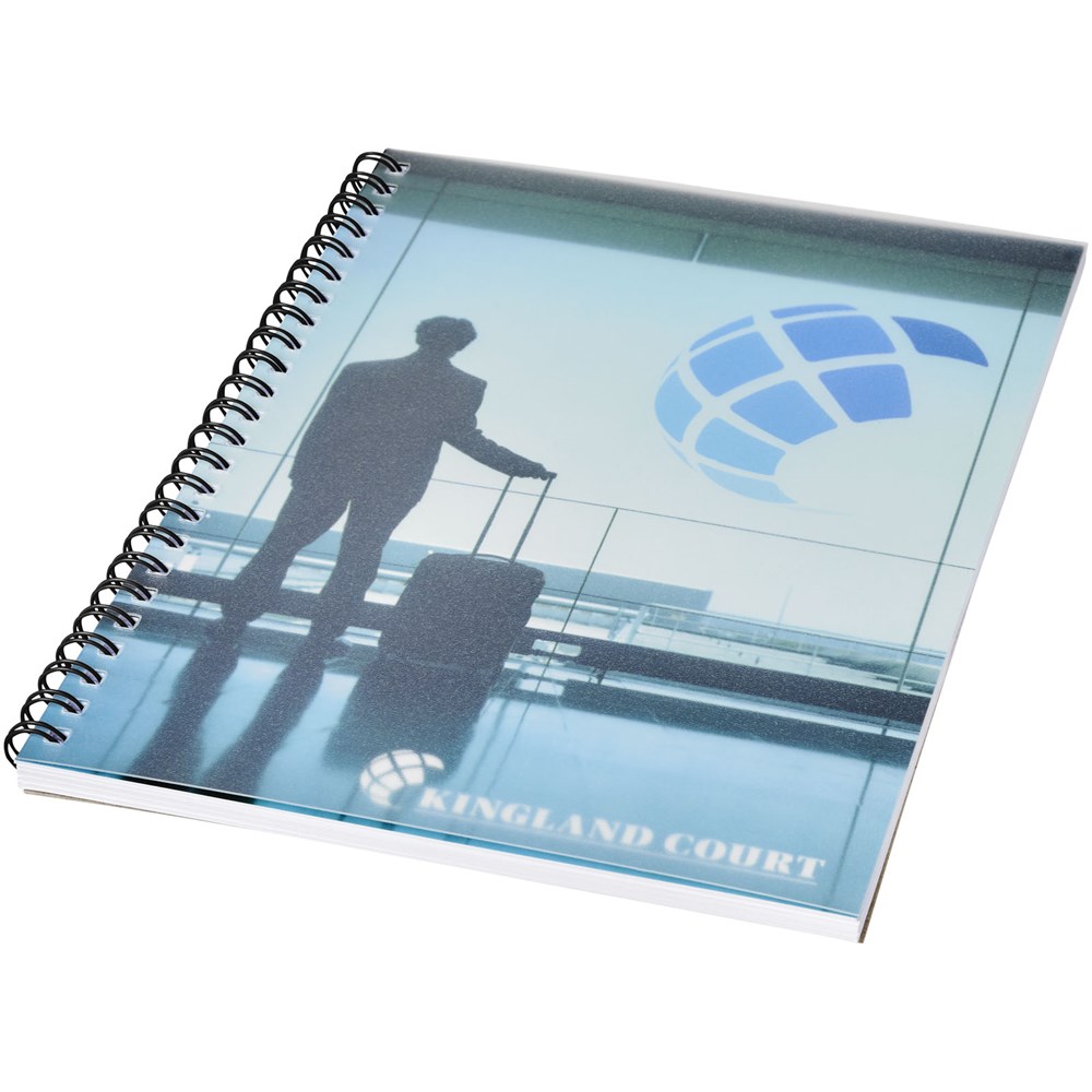 Desk-Mate® A5 Spiralnotizbuch.Standardlieferung mit 50 Blatt 80g/m2-Papier, einem glänzenden Karton-Deckblatt (250g/m2) und einem transparenten Polypropylenumschlag von 450 Mikron. Schwarze oder weiße Spiralbindung. Auch erhältlich mit 100 Blatt. Sie können die Seiten dieses praktischen Notizbuchs mit jedem beliebigen Design gestalten - ob liniertes, kariertes oder gepunktetes Papier - alles ist möglich!
