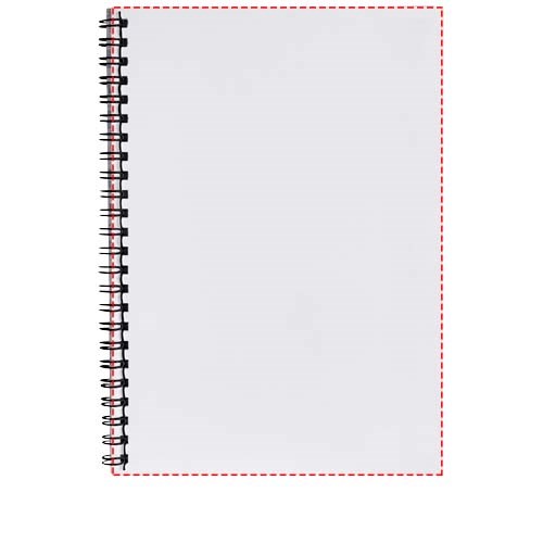 Dieses A4 Notizbuch enthält einen weißen oder schwarzen Draht, 80 g/m2 Blankopapier und eine glänzende Vorder- und Rückseite aus Karton (250 g/m2). Das Standardmodell wird mit 50 Blatt geliefert, aber das Notizbuch ist auch mit 80 Blatt erhältlich. Bedruckung ist sowohl auf den Blättern als auch auf der Vorder- und Rückseite möglich.