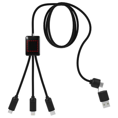 Ladekabel mit Soft-Touch- und Metalloberfläche und leuchtendem Logo. Ausgestattet mit drei Anschlüssen (Typ C, Android, iPhone) sowie USB-A- und USB-C-Ausgang. Bis zu drei Geräte können gleichzeitig geladen werden. Kabellänge (inkl. Stecker): 10 cm. Gesamtkabellänge: 1 Meter. Das Kabel besteht aus recyceltem PET Kunststoff und die Verpackung aus recyceltem Papier und recyceltem Kunststoff.