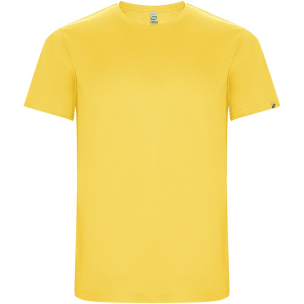 Funktions-T-Shirt aus recyceltem Polyester CONTROL DRY. Rundhalsausschnitt mit farblich abgesetzten Nähten. ECO-Logo-Etikett am Ärmel. Verpackung aus Recyclingmaterial. Herausnehmbares ECO-Etikett. Verpackung aus Recyclingmaterial. Technisches Gewebe. Das Modell ist 180 cm groß und trägt Größe M.