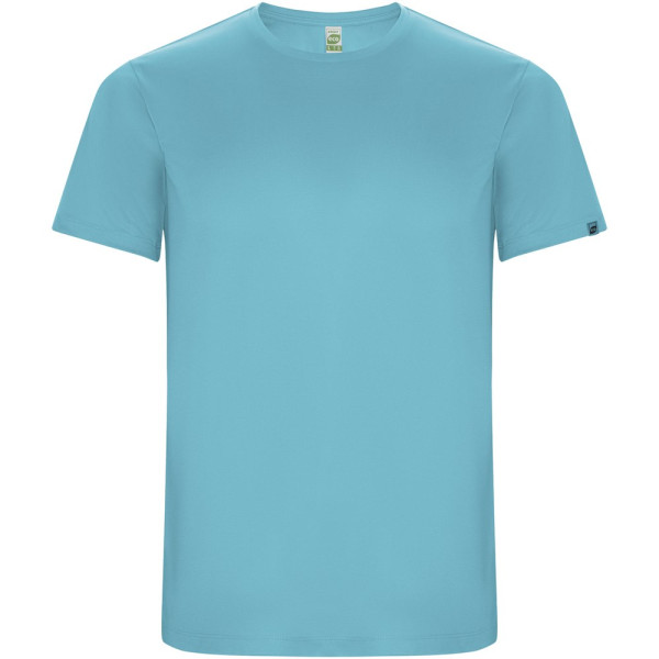 Funktions-T-Shirt aus recyceltem Polyester CONTROL DRY. Rundhalsausschnitt mit farblich abgesetzten Nähten. ECO-Logo-Etikett am Ärmel. Verpackung aus Recyclingmaterial. Herausnehmbares ECO-Etikett. Verpackung aus Recyclingmaterial. Technisches Gewebe. Das Modell ist 180 cm groß und trägt Größe M.