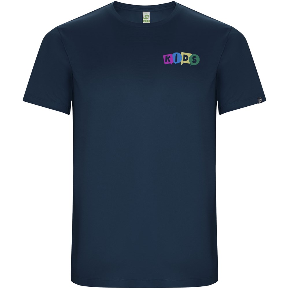 Funktions-T-Shirt aus recyceltem Polyester CONTROL DRY. Rundhalsausschnitt mit farblich abgesetzten Nähten. ECO-Logo-Etikett am Ärmel. Verpackung aus Recyclingmaterial. Herausnehmbares ECO-Etikett. Verpackung aus Recyclingmaterial. Technisches Gewebe. Das Modell ist 115 cm groß und trägt Größe 5/6.