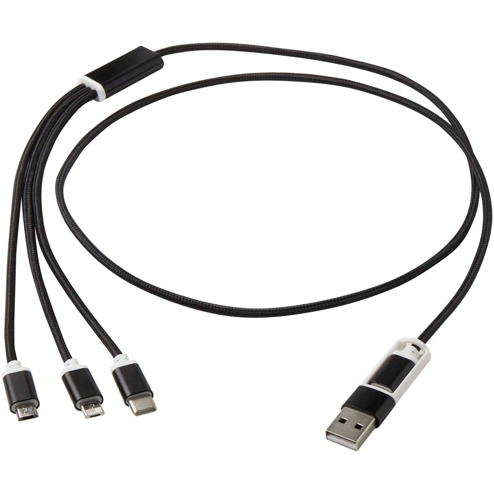 Dieses Kabel verfügt über einen USB-A- und einen Typ-C-Eingangsanschluss in Kombination mit einem Typ-C-, einem Micro-USB- und einem Lightning/Micro-USB-Kombi-Ausgangsanschluss. Diese Anschlüsse ermöglichen das Laden der meisten iOS/Android-Smartphones, Kameras, Powerbanks und Ohrhörer. Das Kabel ist 100 cm lang und besteht aus recyceltem Aluminium und RPET.