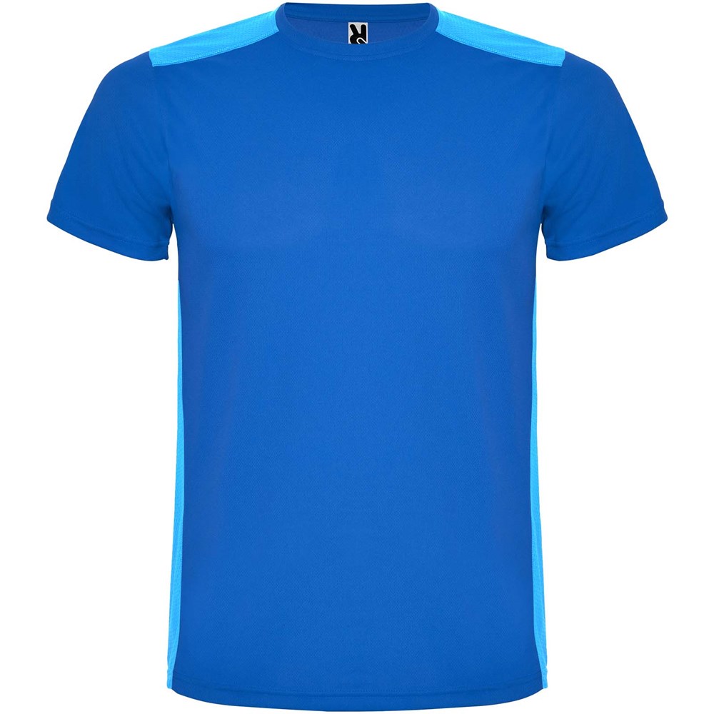 Funktions-T-Shirt aus atmungsaktivem Stoff. Rundhalsausschnitt. Kombination aus zwei Polyestergeweben im Rücken- und Schulterbereich. Polyester Bienenwabe Vorne und 3D-Netz Polyester auf Schulter und Rücken. Material ist feuchtigkeitabsorbierend. Ziernähte auf den Schultern und Seiten. Schnitt mit verlängertem Rückenteil. Abnehmbares Etikett.