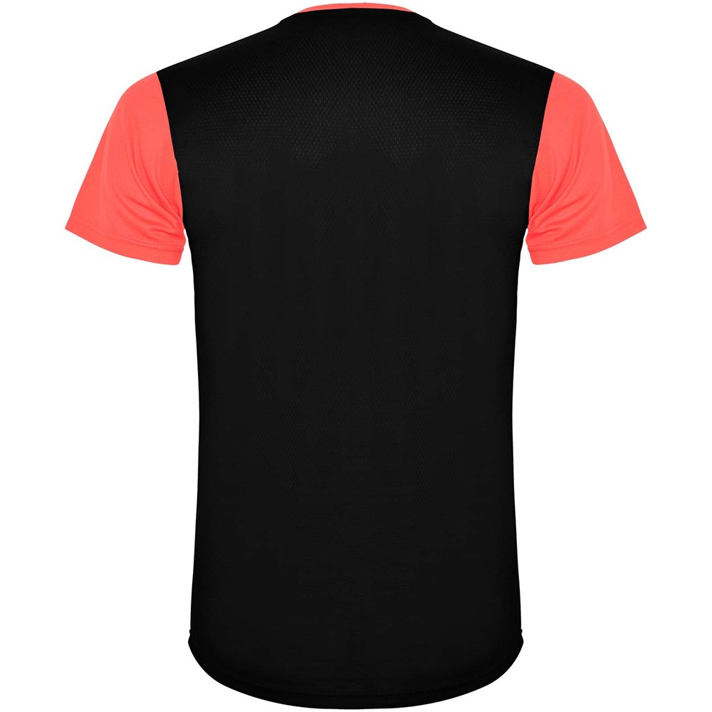 Funktions-T-Shirt aus atmungsaktivem Stoff. Rundhalsausschnitt. Kombination aus zwei Polyestergeweben im Rücken- und Schulterbereich. Polyester Bienenwabe Vorne und 3D-Netz Polyester auf Schulter und Rücken. Material ist feuchtigkeitabsorbierend. Ziernähte auf den Schultern und Seiten. Schnitt mit verlängertem Rückenteil. Abnehmbares Etikett.