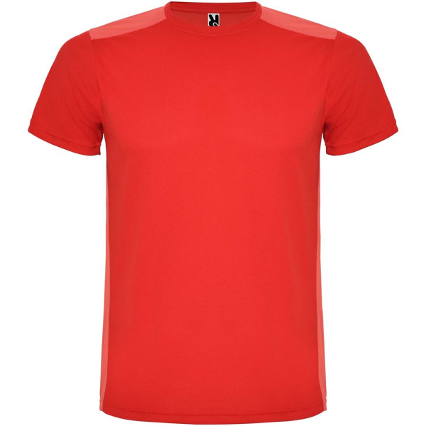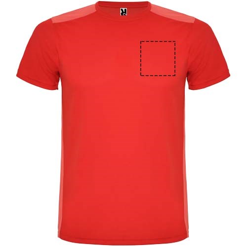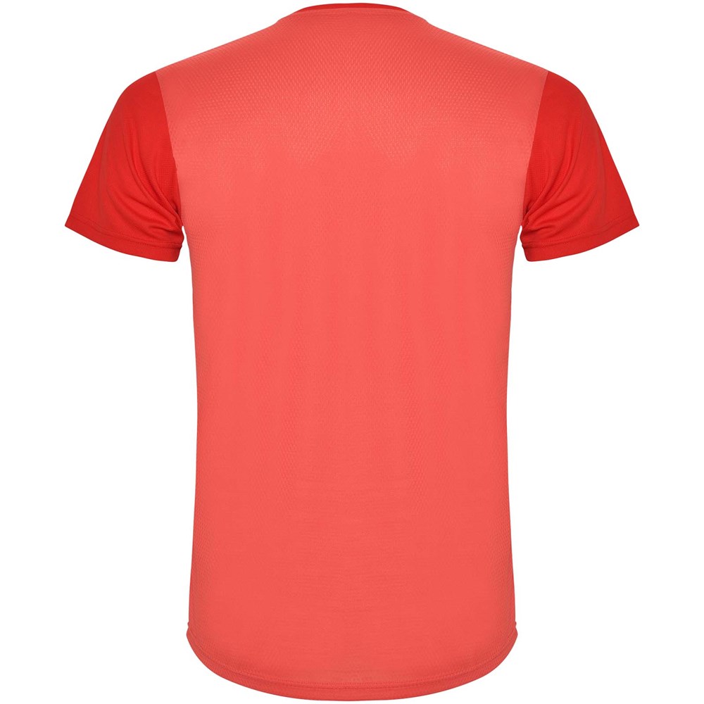 Funktions-T-Shirt aus atmungsaktivem Stoff. Rundhalsausschnitt. Kombination aus zwei Polyestergeweben im Rücken- und Schulterbereich. Polyester Bienenwabe Vorne und 3D-Netz Polyester auf Schulter und Rücken. Material ist feuchtigkeitabsorbierend. Ziernähte auf den Schultern und Seiten. Schnitt mit verlängertem Rückenteil. Abnehmbares Etikett.