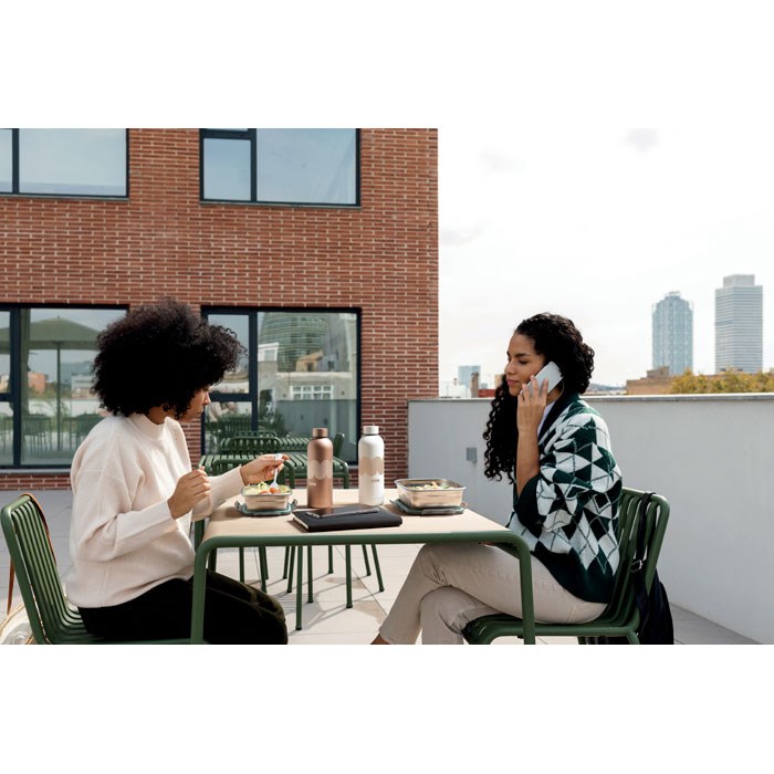 Lunchbox aus recyceltem Edelstahl mit Deckel aus PP und 4-seitigem Klickverschluss. Füllmenge: 850 ml.