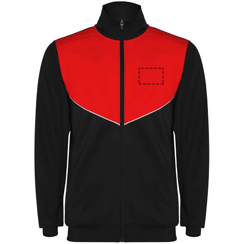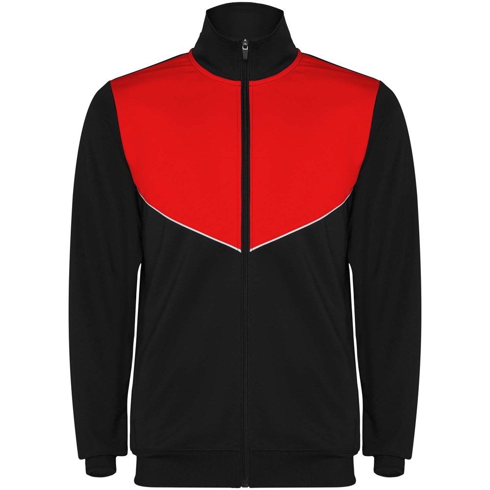 Trainingsanzug aus leichtem und elastischem Stoff. Jacke mit farblich abgesetzten Nähten im Brustbereich. Hoher Kragen mit Kontrastnähten. Zentraler Frontreißverschluss. Seitentaschen. 2x2-Rippenbündchen an Ärmeln und Bund. Hose mit elastischem Bund und Kordelzug. Seitliche Kontrasteinsätze mit Steppnaht. Beinsaum mit Reißverschluss.