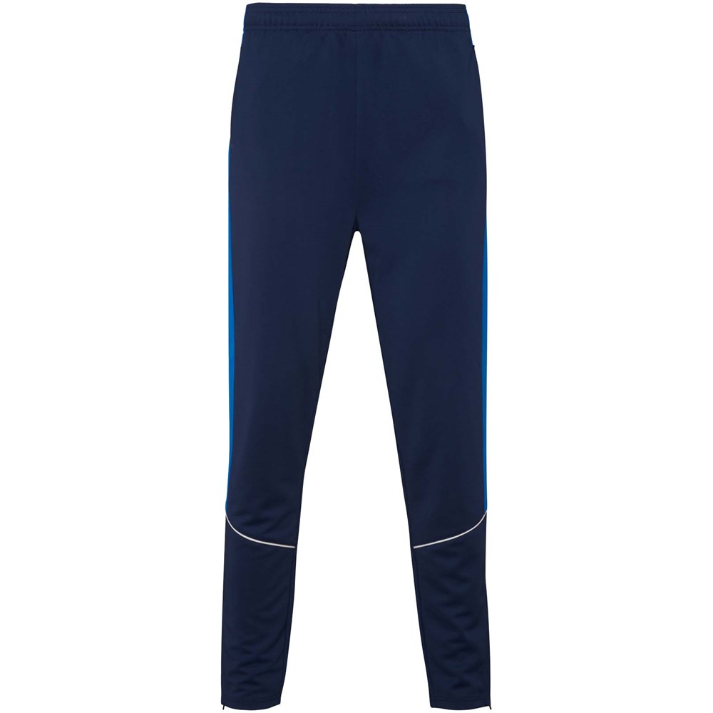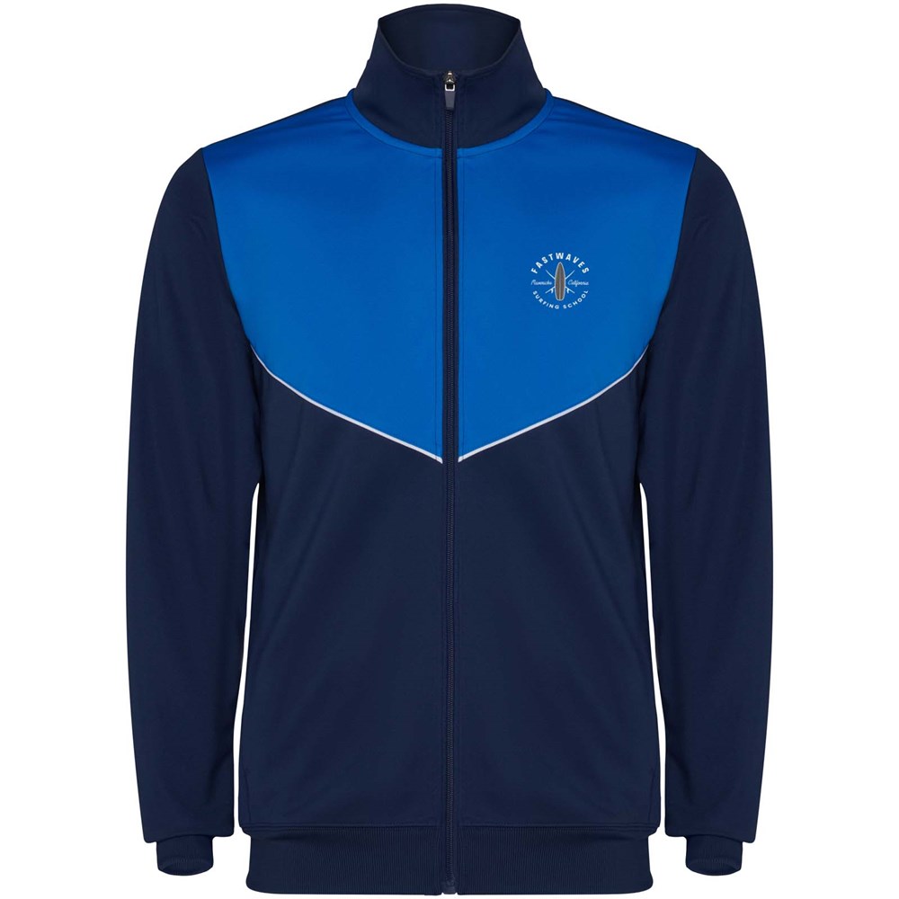 Trainingsanzug aus leichtem und elastischem Stoff. Jacke mit farblich abgesetzten Nähten im Brustbereich. Hoher Kragen mit Kontrastnähten. Zentraler Frontreißverschluss. Seitentaschen. 2x2-Rippenbündchen an Ärmeln und Bund. Hose mit elastischem Bund und Kordelzug. Seitliche Kontrasteinsätze mit Steppnaht. Beinsaum mit Reißverschluss.