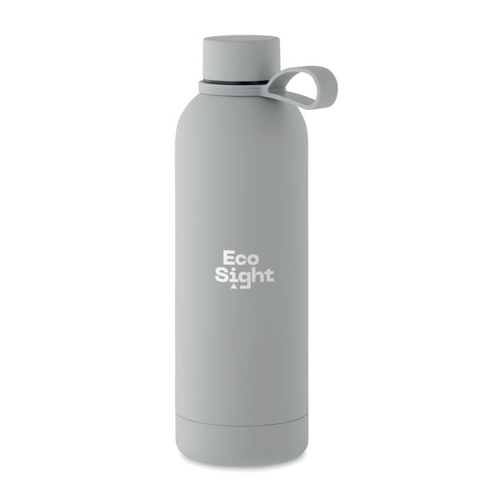 Doppelwandige Vakuum-Isolierflasche aus recyceltem Edelstahl (90% recycelter Edelstahl und 10% Edelstahl) mit gummiertem Finish und Schlaufe aus Silikon. Auslaufsicher. Füllmenge: 500 ml.