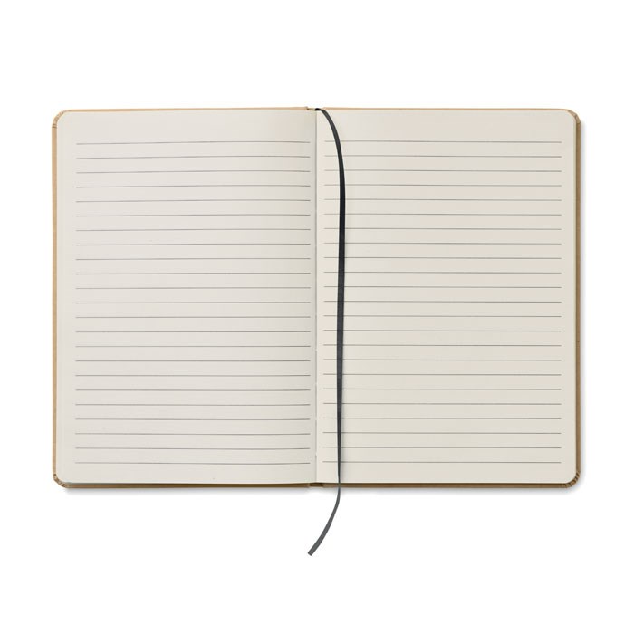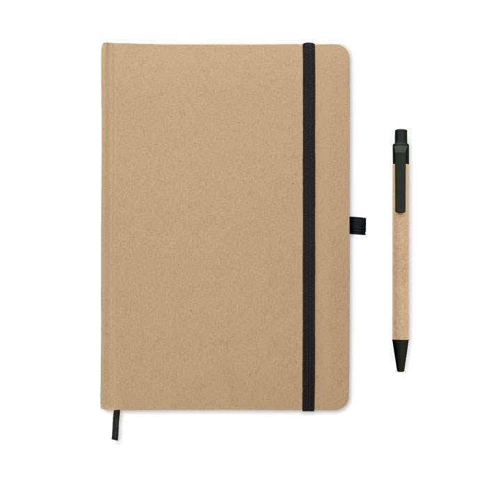 DIN A5 Notizbuch mit gebundenem Hard Cover aus recyceltem Karton. 80 Blatt (160 Seiten) recyceltes, liniertes Papier. Elastisches Verschlussband, Lesebändchen und Stiftschlaufe. Inkl. Druckkugelschreiber mit Schaft aus Recyclingpapier. Blaue Tinte.