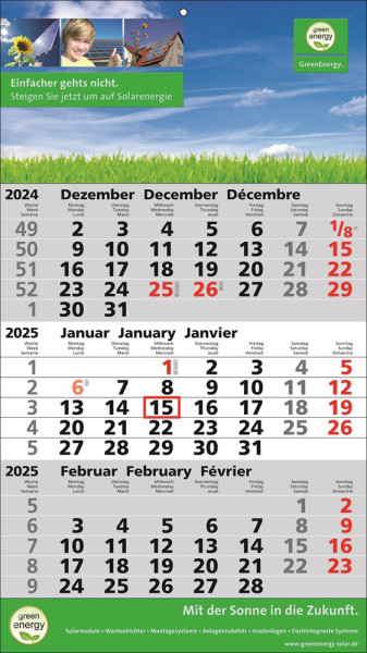 Papierwandkalender mit 3 Monaten auf einer Seite + Werbemöglichkeit auf Fußleiste, 3-sprachig (D,GB,F), dt. Feiertage