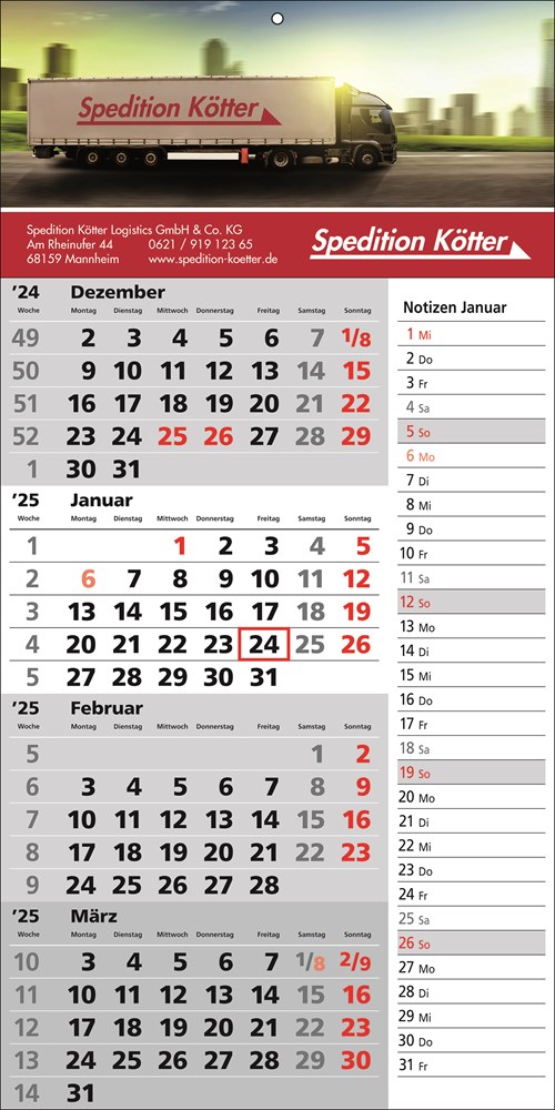Papierwandkalender mit 4 Monaten auf einer Seite, 1-sprachig deutsch, deutsche Feiertage in rot und Notizspalte für Einträge