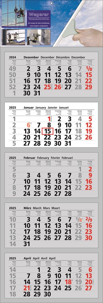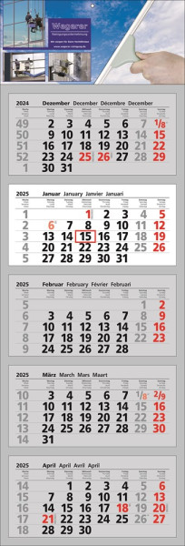 Papierwandkalender mit 5 Monaten auf 5 einzelnen Blöcken, Druck auf angehefteter Kopflasche, 4-sprachig (D, GB, F, NL)
