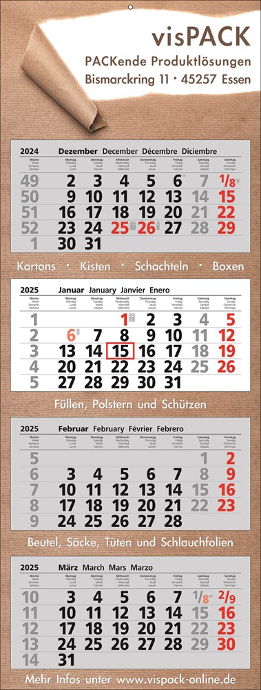 Papierwandkalender extra groß mit 4 Monaten auf 4 einzelnen Blöcken, 4-sprachig (D,GB,F,E)