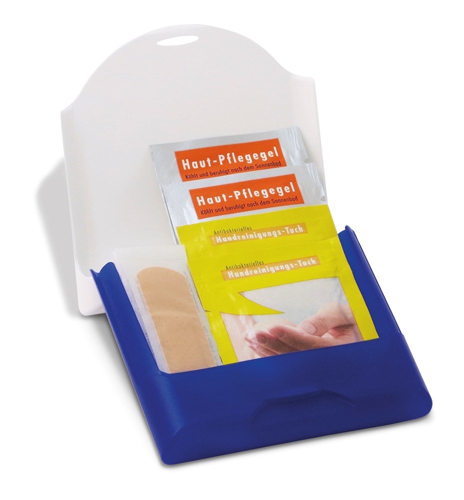 Praktische Kunststoffbox befüllt mit 10x Pflaster-Strips (ca. 70x20mm), 2x Handreinigungstuch, 2x Haut-Pflegegel, 1 Beilagenblatt mit den Inhaltsangaben