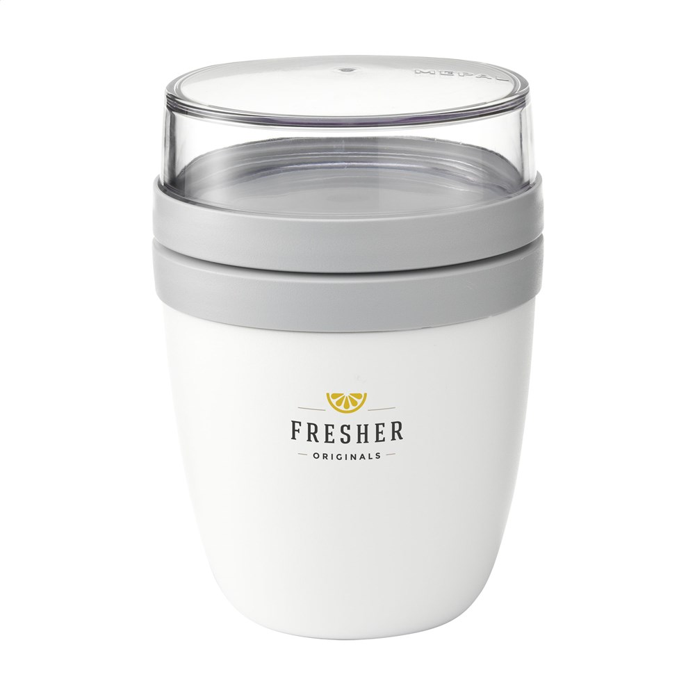 Dieser Plastikbehälter der Marke Mepal ist ein praktisches Produkt zum Mitführen von Lebensmitteln. Der Behälter hat zwei Teile. Durch eine Drehbewegung lassen sich die beiden Teile voneinander trennen. Beide Teile haben einen separaten Deckel. Die ideale Lösung, um Geschmiere beim Mischen zu vermeiden. Das Fassungsvermögen des oberen, transparenten Behälters beträgt 200 ml, d. h. dort ist Platz für ca. 75 g Müsli oder Obst. Das Fassungsvermögen des unteren Behälters bietet mit 500 ml genug Platz für eine Portion Suppe, Nudeln oder Joghurt. Ein qualitativ hochwertiges Produkt. Lebensmittelgeprüft und auslaufsicher. Geeignet für Mikrowelle (außer Deckel) und Gefriertruhe. 2 Jahre Mepal Herstellergarantie. Hergestellt in den Niederlanden. LAGERBESTANDSINFORMATION: Bis zu 1.000 Stück innerhalb von 10 Arbeitstagen verfügbar. Ausnahmen vorbehalten. Verpackt pro Stück.