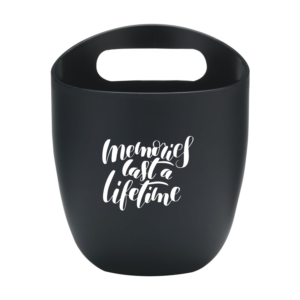 Eleganter Flaschenkühler aus robustem Kunststoff. Mit praktischem Griff. Füllen Sie diesen Kühler mit Eiswürfeln zum kalten Servieren von Erfrischungsgetränken, Bier- oder Weinflaschen. 100% recycelbar. Fassungsvermögen 2.500 ml. Hergestellt in Deutschland.